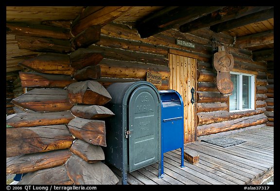 Mail boxes, log house postal office, Slana. Alaska, USA