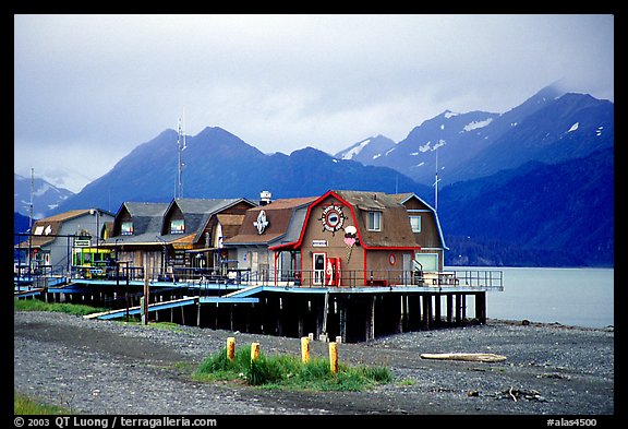 Stilt houses on the Spit, Kenai Mountains in the backgound. Homer, Alaska, USA
