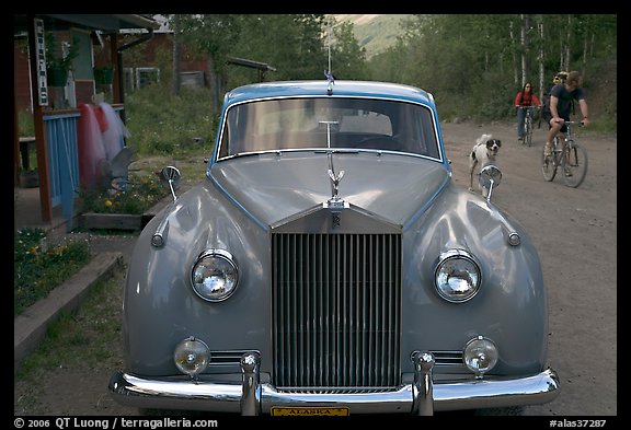 Rolls Royce on dirt road with mountain bikers in background. McCarthy, Alaska, USA