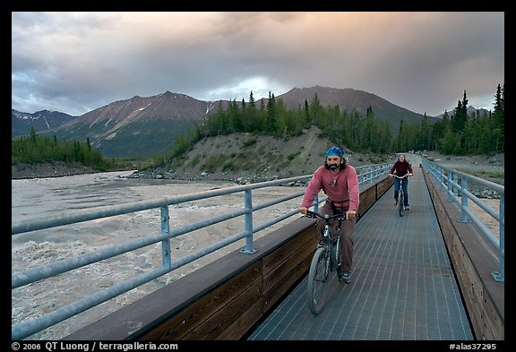 Mountain bikers crossing Kennicott River Footbridge at sunset. McCarthy, Alaska, USA