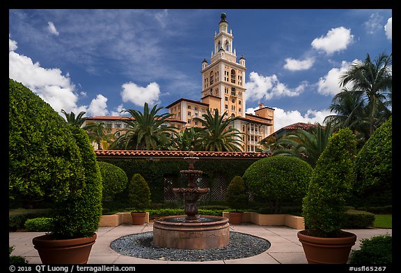 Garden fountain and Biltmore Hotel. Coral Gables, Florida, USA
