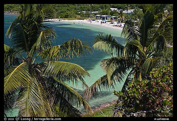 Beach seen from above through palm trees, Bahia Honda Key. The Keys, Florida, USA