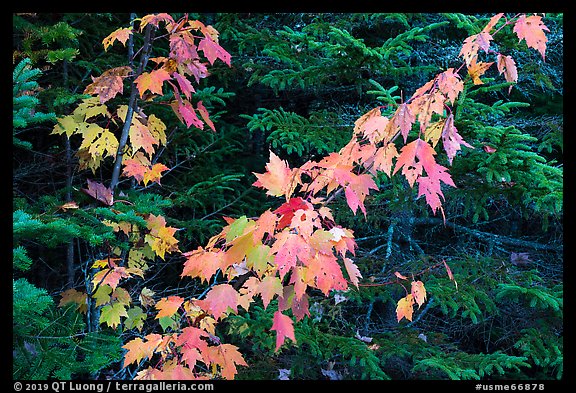 Orange mapple leaves and spruce. Katahdin Woods and Waters National Monument, Maine, USA