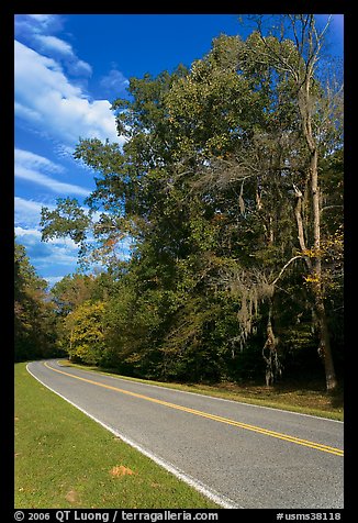 Road turn with trees and Spanish Moss. Natchez Trace Parkway, Mississippi, USA (color)
