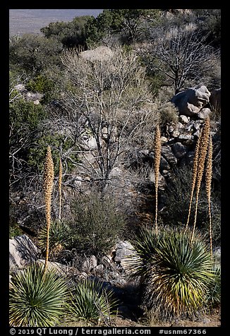 Sotol with blooms and bare trees in winter. Organ Mountains Desert Peaks National Monument, New Mexico, USA