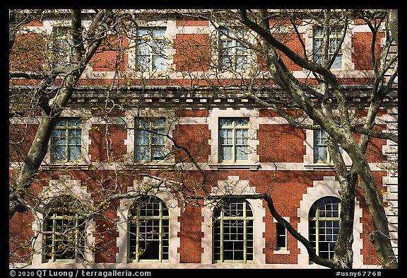Trees and main building facade, Ellis Island, Statue of Liberty National Monument. NYC, New York, USA