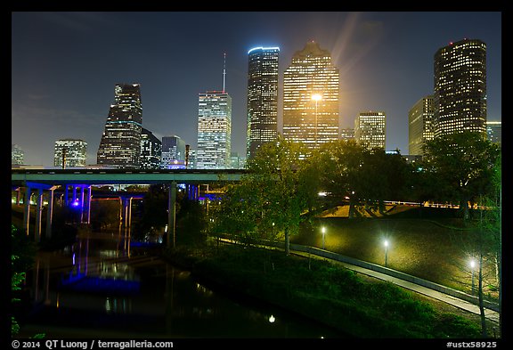 Buffalo Bayou and skyline at night. Houston, Texas, USA