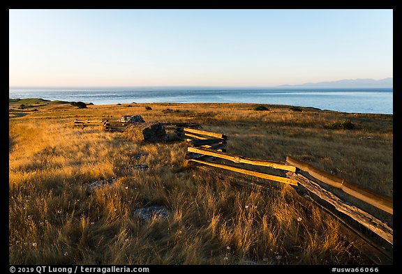 Wooden fence, Cattle Point, Sunrise, San Juan Islands National Monument, San Juan Island. Washington