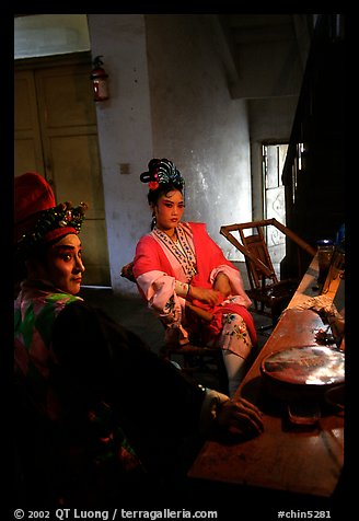 Sichuan opera actors getting ready in the backstage before the performance. Chengdu, Sichuan, China