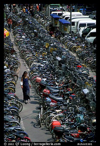 Woman walking in a bicycle parking lot. Chengdu, Sichuan, China