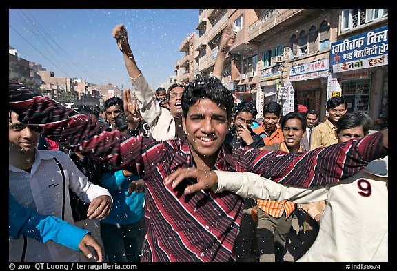 Young men celebrating during wedding procession. Jodhpur, Rajasthan, India
