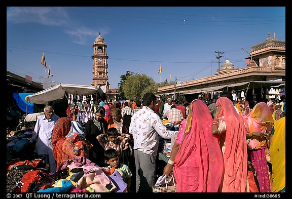 Sadar Market, with women in colorful sari and clock tower. Jodhpur, Rajasthan, India