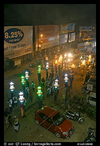 Street and wedding procession by night from above. Varanasi, Uttar Pradesh, India
