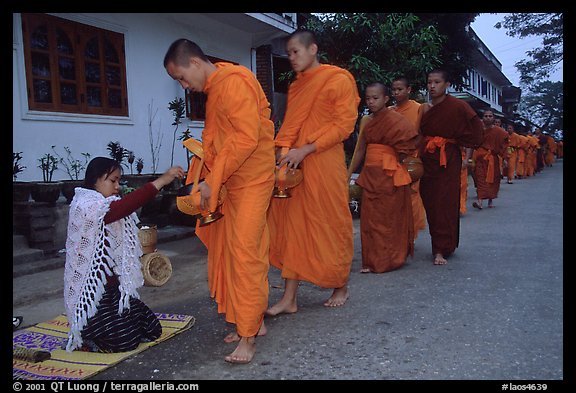 Buddhist monks receiving alm from woman. Luang Prabang, Laos