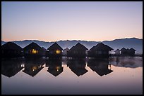 Long boat,  stilts huts, and mountains, sunrise. Inle Lake, Myanmar ( color) Stilts huts. Inle Lake, Myanmar ( color) Water level marker topped by shrine. Inle Lake, Myanmar ( color) Stilts huts and temple. Inle Lake, Myanmar ( color) Huts on stilts in middle of lake. Inle Lake, Myanmar ( color) Restaurant built on stilts in middle of lake. Inle Lake, Myanmar ( color) Villagers returning from a day of work in the fields, Maing Thauk Village. Inle Lake, Myanmar ( color) Villagers walking on path to jetty, Maing Thauk Village. Inle Lake, Myanmar ( color) Family walking out of stilt house on precarious bridge. Inle Lake, Myanmar ( color) Canal, fields, and hills, Maing Thauk Village. Inle Lake, Myanmar ( color) Woman riding with child in front of boat in Maing Thauk Village. Inle Lake, Myanmar ( color) Canal at sunset, Maing Thauk Village. Inle Lake, Myanmar ( color) Children rowing across canal towards floating gardens, Maing Thauk Village. Inle Lake, Myanmar ( color) Houses and canal at sunset, Maing Thauk Village. Inle Lake, Myanmar ( color) Floating gardens at sunset, Maing Thauk Village. Inle Lake, Myanmar ( color) Birds perched on fence. Inle Lake, Myanmar ( color) Sunken canoe at sunset. Inle Lake, Myanmar ( color) Sunken canoe and ripples. Inle Lake, Myanmar ( color) Boat leaving resort in dawn mist. Inle Lake, Myanmar ( color) Greeters at dawn. Inle Lake, Myanmar ( color) Sunken canoe and aquatic plants in glassy water. Inle Lake, Myanmar ( color) Greeters in traditional costume. Inle Lake, Myanmar ( color) Myanmar Treasure Resort at dawn. Inle Lake, Myanmar ( color) Cottages on stilts at dawn. Inle Lake, Myanmar ( color) Deck, pavillion, and longtail boats at sunset. Inle Lake, Myanmar ( color) Cottages on stilts at dawn, Myanmar Treasure Resort. Inle Lake, Myanmar ( color) Entrance of Myanmar Treasure Resort at night. Inle Lake, Myanmar ( color) Main deck of Myanmar Treasure Resort at night. Inle Lake, Myanmar ( color)