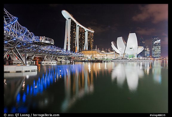 Helix Bridge, Marina Bay Sands, and ArtScience Museum at night. Singapore