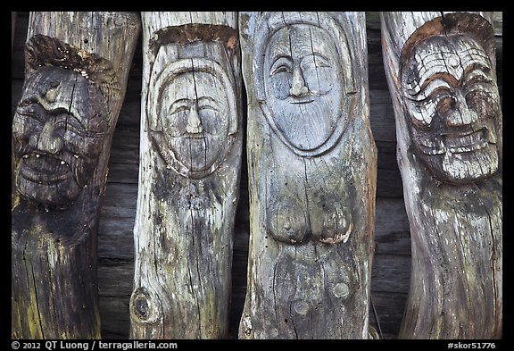 Sculptures on wood stems. Hahoe Folk Village, South Korea