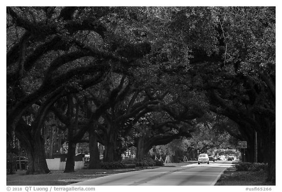 Road through tree tunnel. Coral Gables, Florida, USA