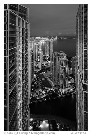 High view of Brickell Point, Brickell Key and Biscayne Bay at night, Miami. Florida, USA