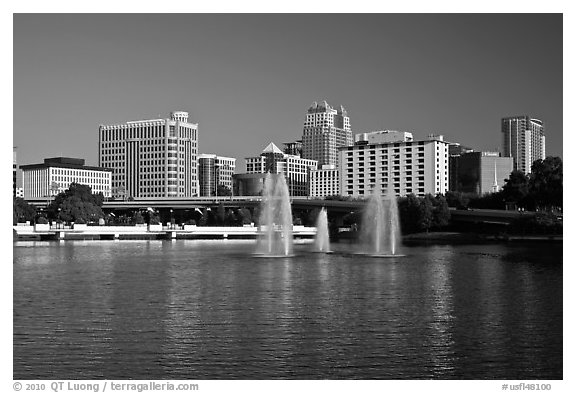 Fountains and morning skyline from Lake Lucerne. Orlando, Florida, USA