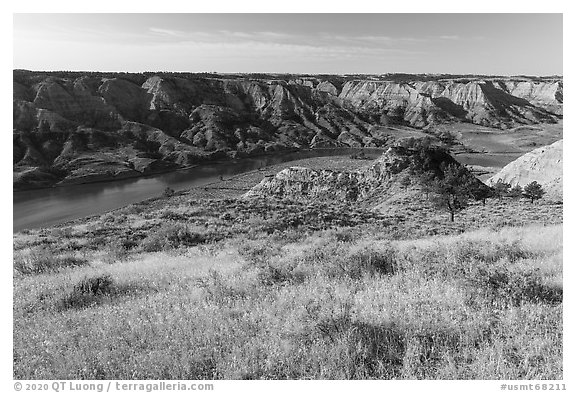 Grasses, badlands, and Missouri River. Upper Missouri River Breaks National Monument, Montana, USA