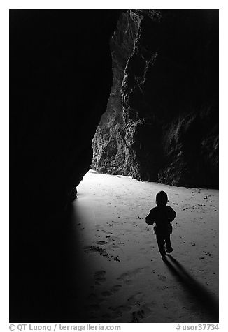 Infant walking towards the light in sea cave. Bandon, Oregon, USA