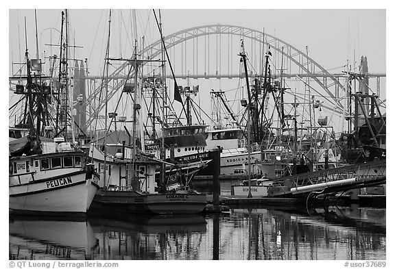 Commercial fishing boats and Yaquina Bay Bridge at dawn. Newport, Oregon, USA