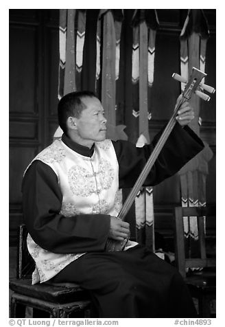 Musician playing a three-stringed traditional moon guitar. Baisha, Yunnan, China