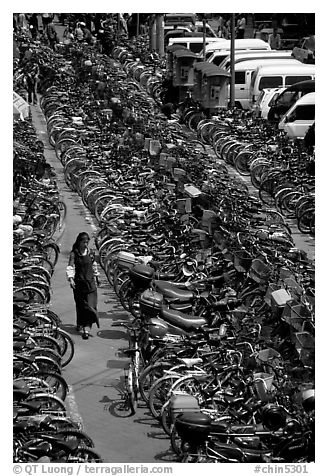 Woman walking in a bicycle parking lot. Chengdu, Sichuan, China