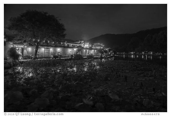 Houses reflected in South Lake at night. Hongcun Village, Anhui, China