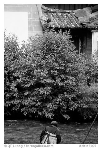 Naxi woman sitting next to a canal. Lijiang, Yunnan, China