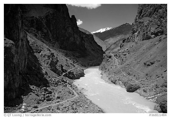 Chorten, trail, and river valley, Zanskar, Jammu and Kashmir. India