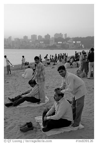 Head masseurs and Mumbai skyline at sunset, Chowpatty Beach. Mumbai, Maharashtra, India