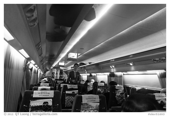 Hostess walking inside high speed KTX train car. Seoul, South Korea