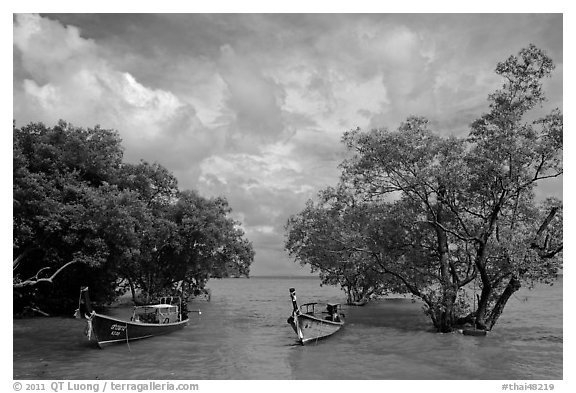 Boats moored near mangrove trees, Railay East. Krabi Province, Thailand