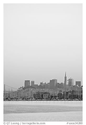 Sausalito houseboats and San Francisco skyline, sunset. San Francisco, California, USA