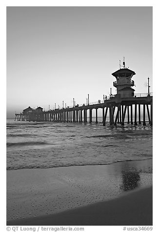 Huntington Pier and reflections in wet sand at sunset. Huntington Beach, Orange County, California, USA