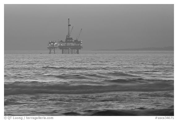 Off-shore petrol extraction platforms, sunset. Huntington Beach, Orange County, California, USA