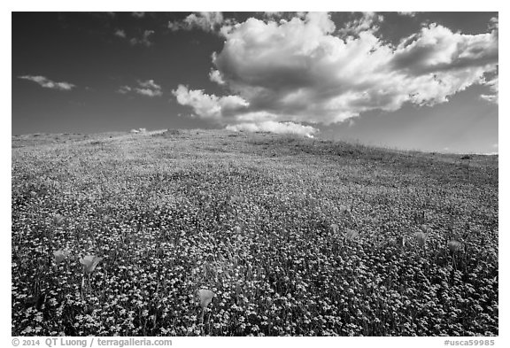 Hill solidly covered with goldfield flowers and a few poppies. Antelope Valley, California, USA
