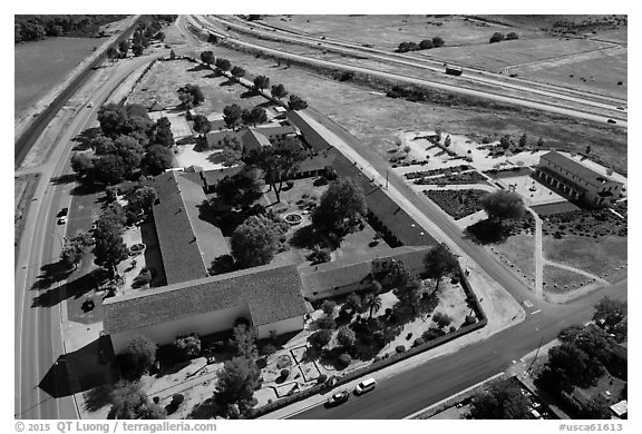 Aerial view of Mission San Miguel between railroad and highway. California, USA