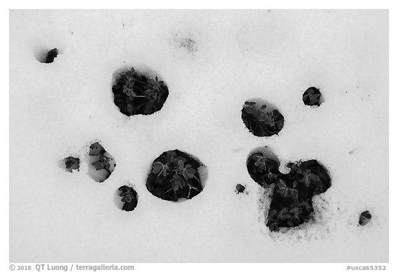 Close-up of plants piercing snow patch, Snow Mountain. Berryessa Snow Mountain National Monument, California, USA