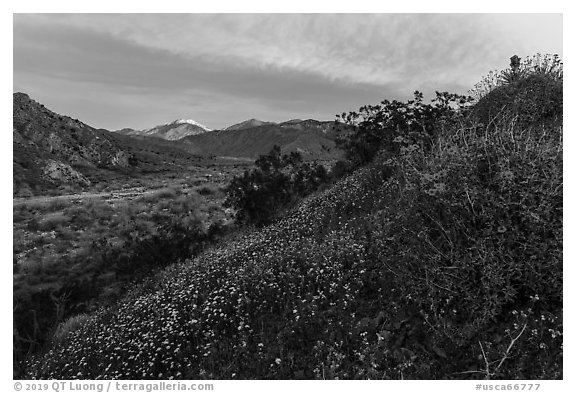 Wildflowers at sunrise with distant snowy San Giorgono Mountain. Sand to Snow National Monument, California, USA