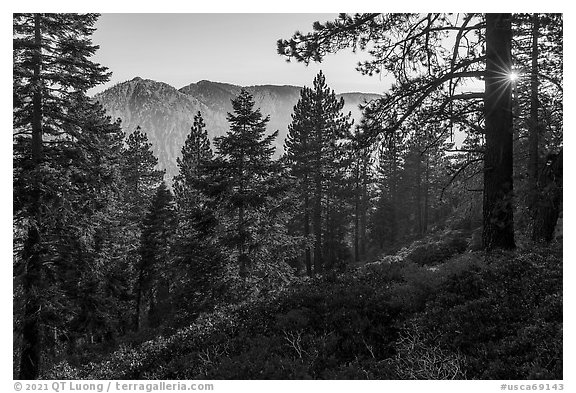 Forest with Yucaipa Ridge and sun, San Gorgonio Wilderness. Sand to Snow National Monument, California, USA