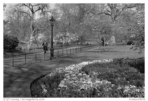 Businessman walking in Saint James Park amongst flowers. London, England, United Kingdom