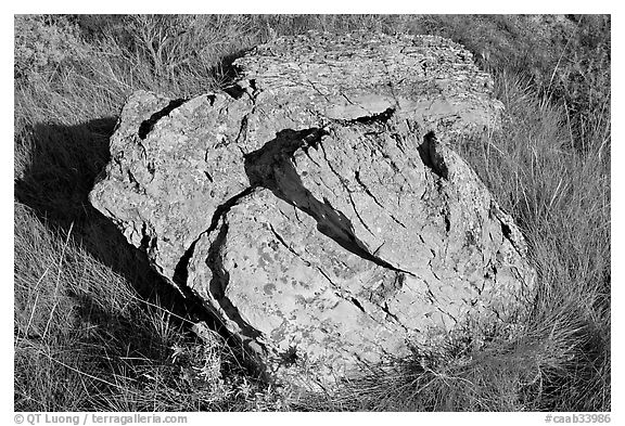 Rock with lichen lying in grass, Dinosaur Provincial Park. Alberta, Canada