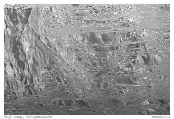 Reflections in partly frozen lake, Cavell Pond. Jasper National Park, Canadian Rockies, Alberta, Canada