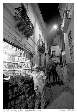 Man at a Newstand booth in a narrow callejone at night. Guanajuato, Mexico