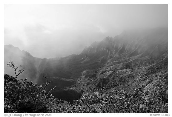 Kalalau Valley and mist, late afternoon. Kauai island, Hawaii, USA