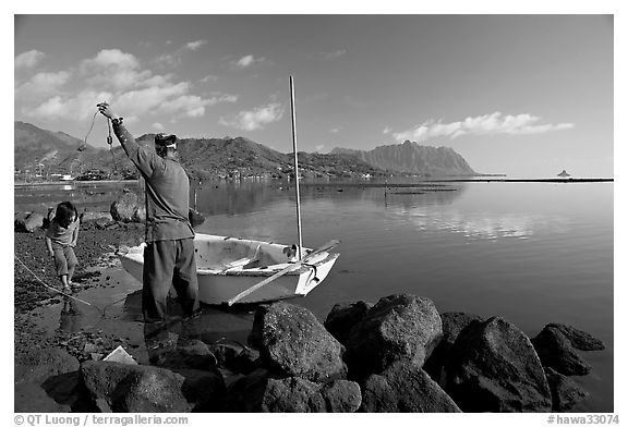 Fisherman pulling out fish out a net, with girl looking, Kaneohe Bay, morning. Oahu island, Hawaii, USA