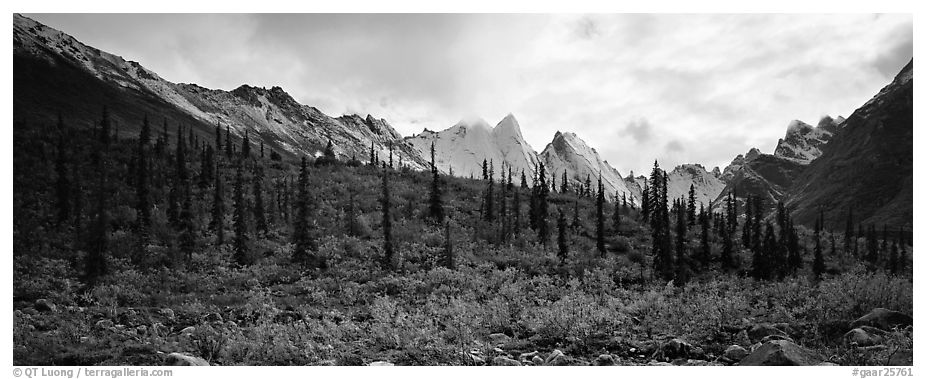 Taiga forest and peaks with fresh dusting of snow. Gates of the Arctic National Park, Alaska, USA. (Panoramic)